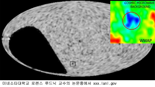 ³ÃÁ¡(WMAP Cold Spot)¡¯¶ó ºÒ¸®´Â ÀÌ ÁöÁ¡Àº ¿ìÁÖ¹è°æº¹»ç Áöµµ¿¡¼ ±× ¿Âµµ°¡ ³·¾Æ °Ë°Ô º¸ÀδÙ(»çÁø À§, °ËÀº »ç°¢Çü°ú ºÓÀº ¿ø ¼ÓÀÌ